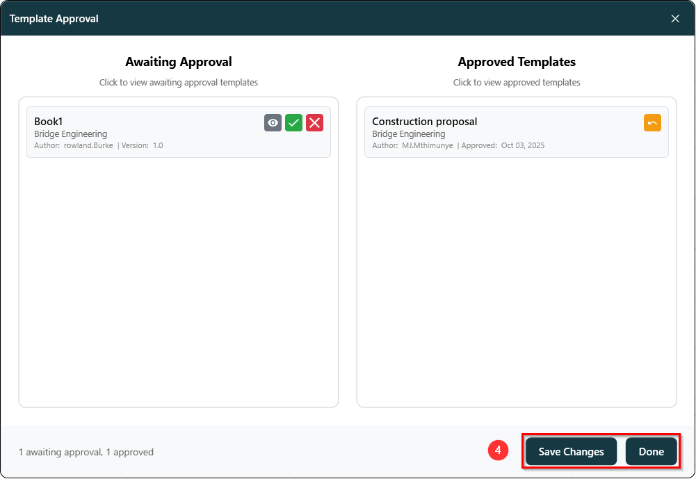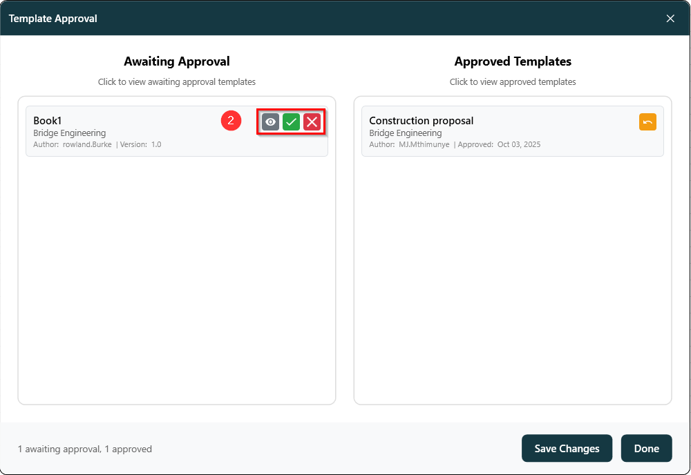 Administrators can view a template to check its contents, then choose to approve it using the ✔️ icon or disapprove it using the ✖️ icon.