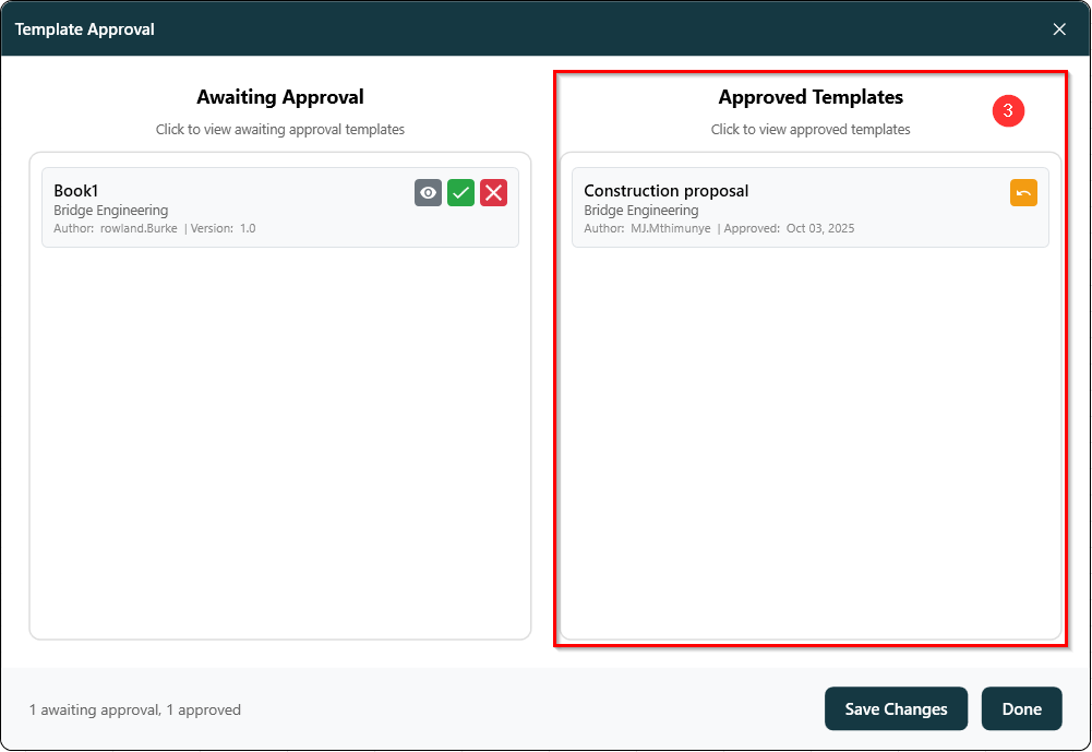 Once approved, the template automatically moves to the Approved Templates column and becomes available in the Template Browser for all users to access.