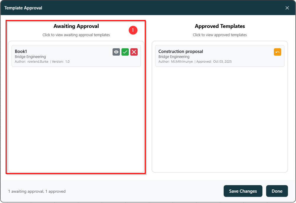 - Approved templates are then shown in the approved templates column to be consumed by all users. The viewport shown in figure 1.3 below shows templates that have been approved.