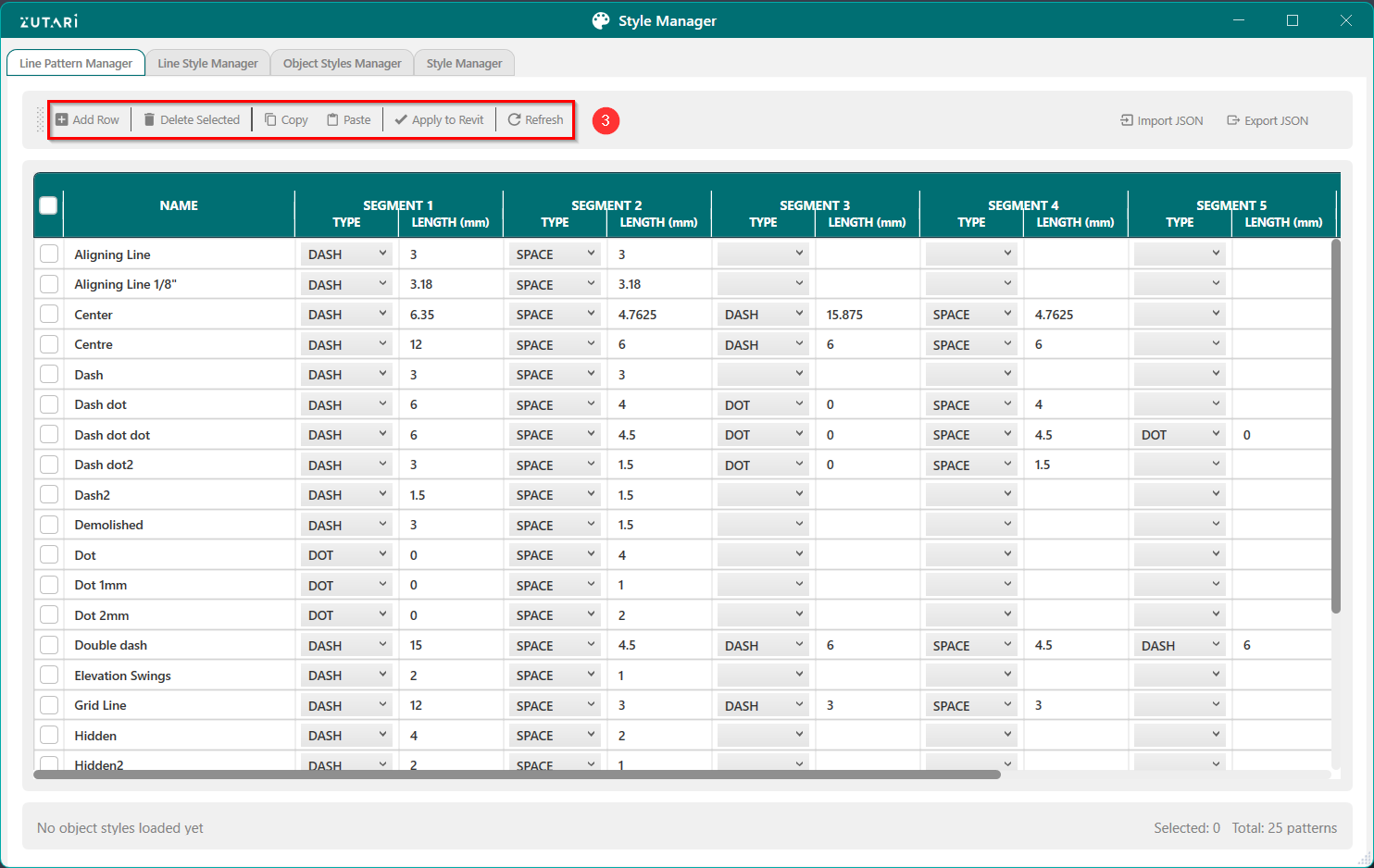 - Create, update, and modify line patterns and apply changes in Revit. The buttons in the left of the Toolbar in figure 1.3 below allows us to create new line patterns, update line patterns and copy existing line patterns to later apply the changes to Revit.