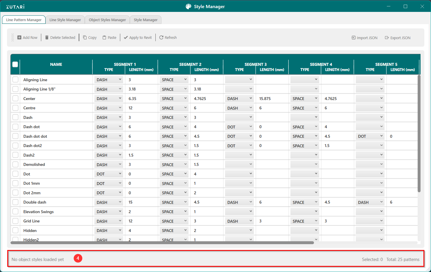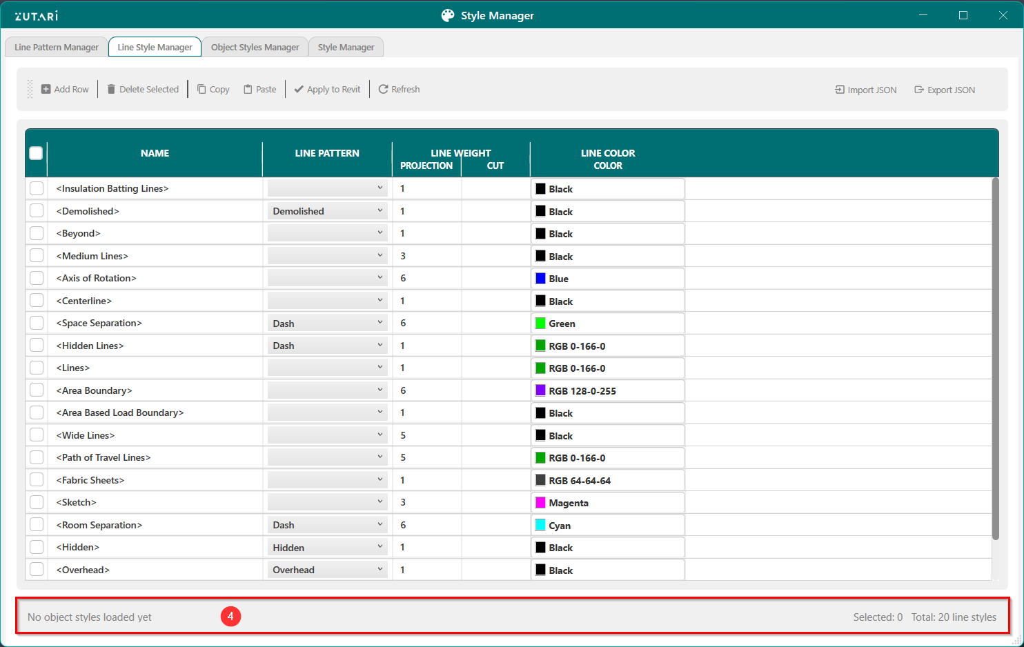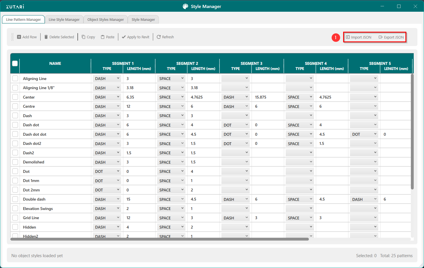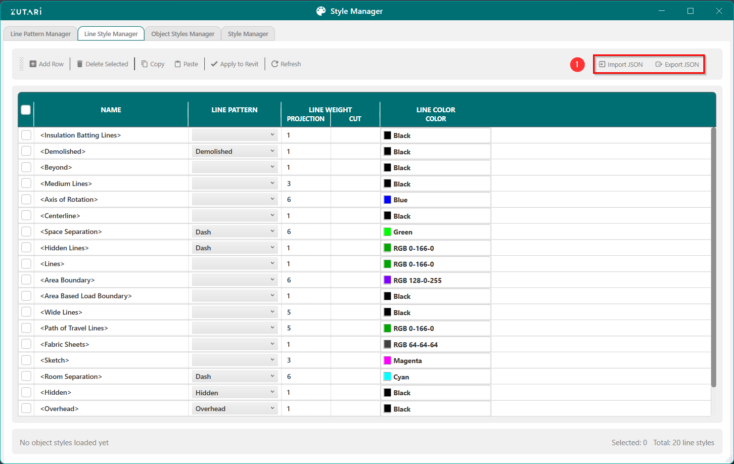 - Import/export JSON configurations to quickly compare object styles, line styles and line patterns. The buttons shown in figure 4.1 below allows us to import line styles, line patterns and object styles in the JSON format.