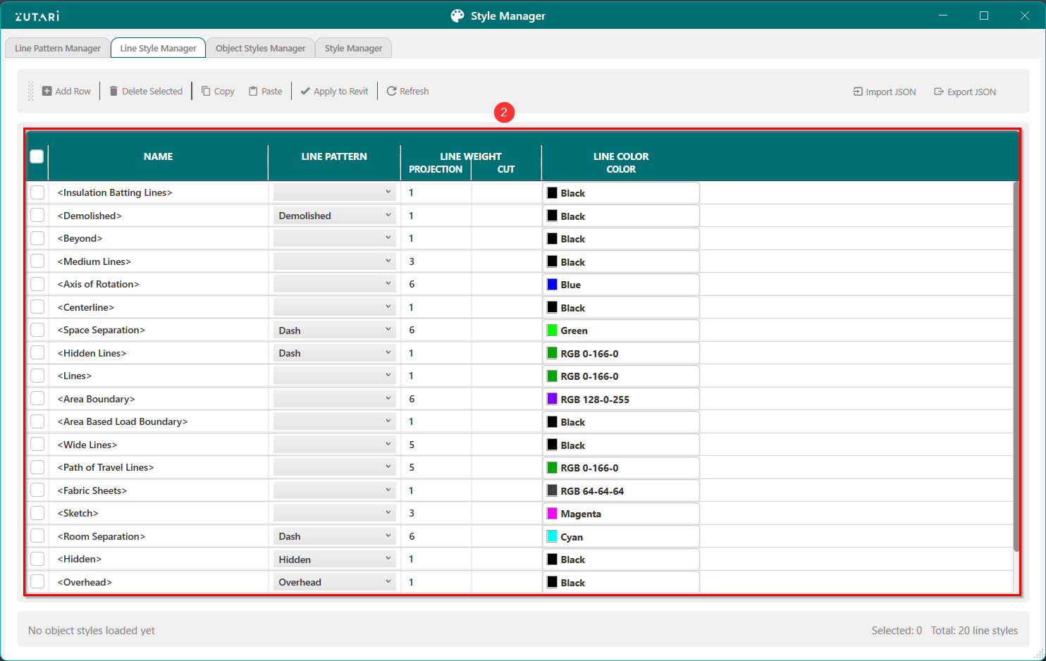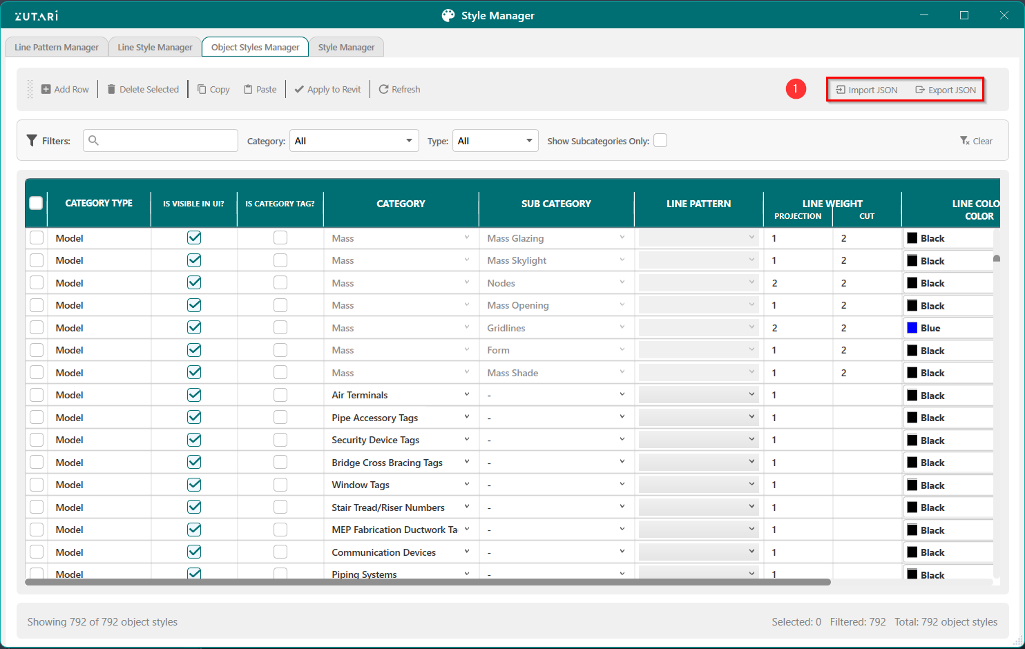 - Import/export JSON configurations to quickly apply standards. The buttons shown in figure 2.1 below allows us to import line styles in the JSON format.