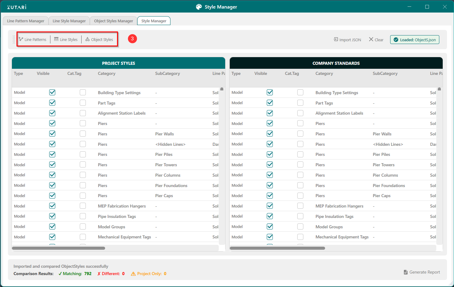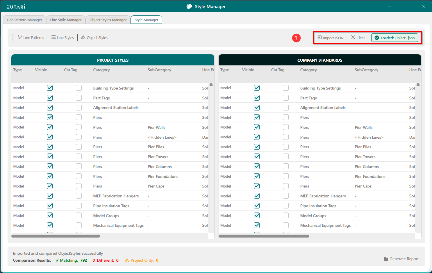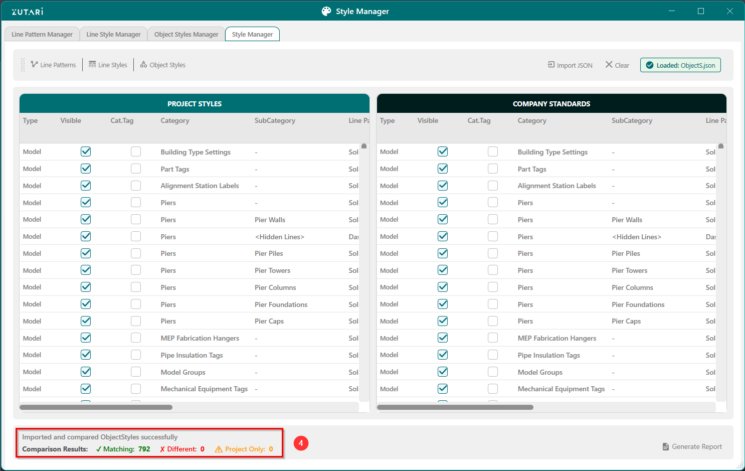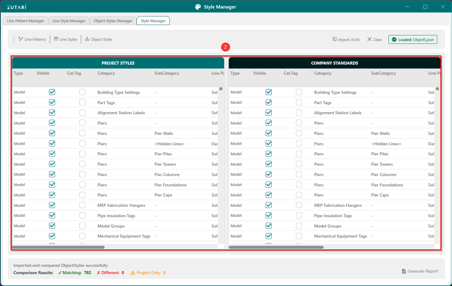- Compare project styles with company standards using JSON imports. The viewport in figure4.2 below shows how you can identify matching, different, or missing styles. Both viewports scroll together for a syncronized experience to help track maching and different styles.
